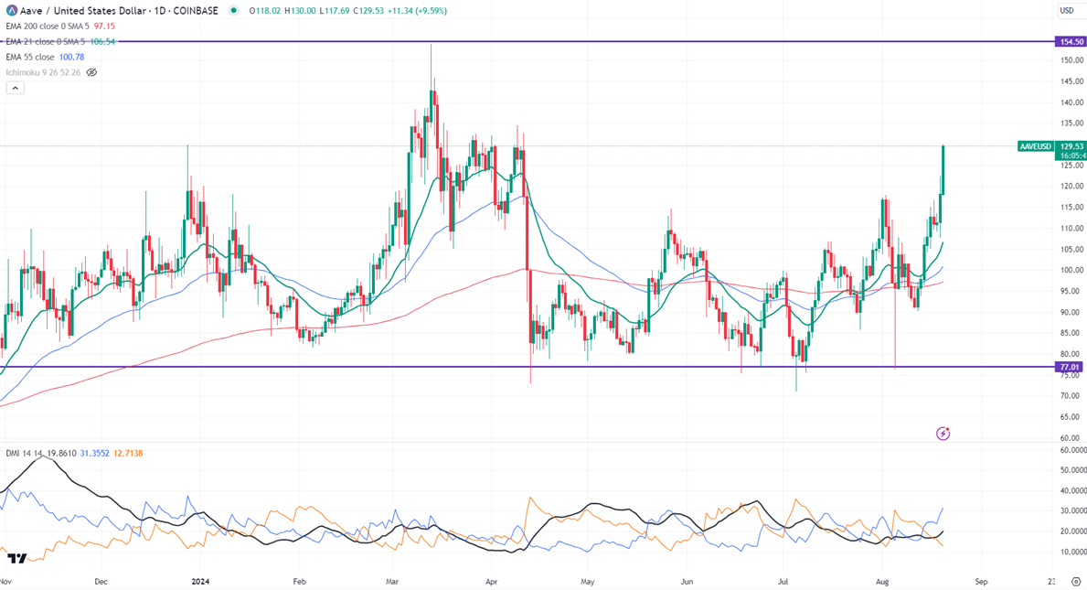 AAVEUSD surged sharply more than 20% in the past two days. The pair holds well above the short-term (21 and 55 EMA) and long-term moving average. It hit a high of $130 and is currently trading around $129.43