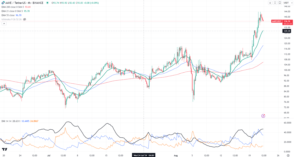 AAVEUSD showed a minor profit booking after jumping more than 55%. The pair holds well above the short-term (21 and 55 EMA) and long-term moving average. It hit a high of $130 and is currently trading around $129.43
