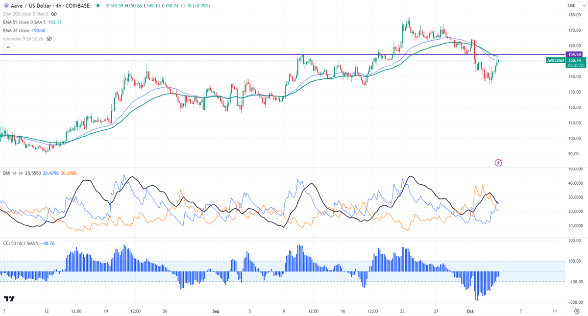 AAVEUSD showed a minor pullback after profit booking. The pair holds below the short-term (34 and 55 EMA) and long-term moving averages. It hit a high of $152.48 and is currently trading around $135.76.