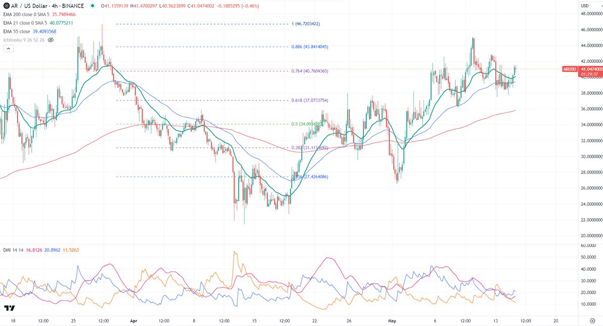ARUSD has gained more than 10% in the past two days. The pair holds well above the short-term (21 and 55 EMA) and long-term moving average. It hit a high of $41.49 and is currently trading around $41.04.