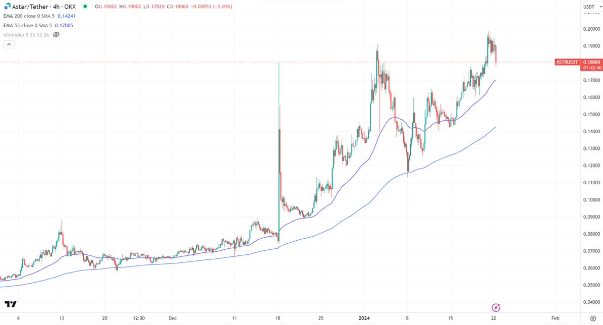 ASTRUSD has traded higher for the past two weeks and surged more than 75%. The pair holds well above the short-term (21 and 55 EMA) and long-term moving average. It hit a high of $0.1985 and is currently trading around $0.1816.