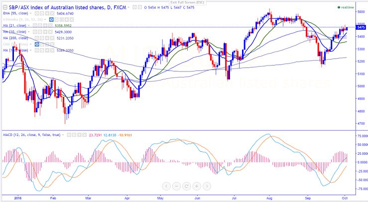 - ASX200 is trading well above Tenken-Sen (5397) and Kijun-Sen (536) in the daily chart.The index has taken support near 10 -day MA and any break below confirms minor weakness.