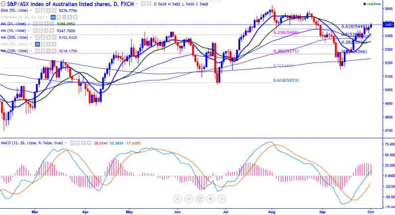 - ASX200 is trading well above Tenken-Sen (5374) and Kijun-Sen (5359) in the daily chart.The index has taken support near 10 -day MA and any break below confirms minor weakness.