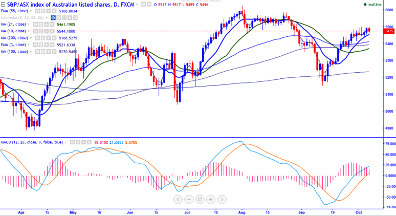 - ASX200 is trading well above Tenken-Sen (5437) and Kijun-Sen (5327) in the daily chart.But it should break above 5502 for further bullishness.