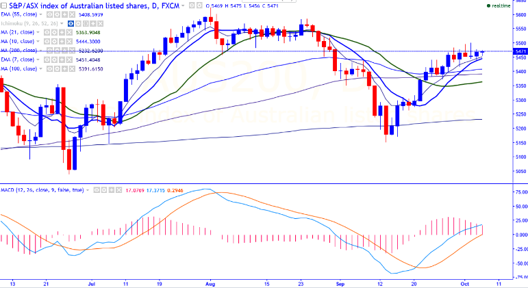 - ASX200 is trading well above Tenken-Sen (5437) and Kijun-Sen (5327) in the daily chart.Any further weakness can be seen below 10- day MA.