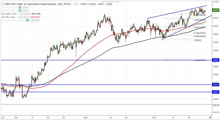 - ASX200 has shown a minor weakness after hitting a high of 6097 on Dec 26th 2017. The index dipped till 6058 and is currently trading around 6078. Short term trend is bullish as long as support 5997 holds. The slight jump in index was mainly due to rise in mining stocks due to high commodity prices.