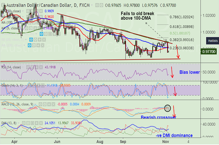Resistance levels - 0.9809 (50-DMA), 0.9820 (20-DMA), 0.9829 (5-DMA), 0.9833 (23.6% Fib retracement of 1.0345 to 0.9675 fall)