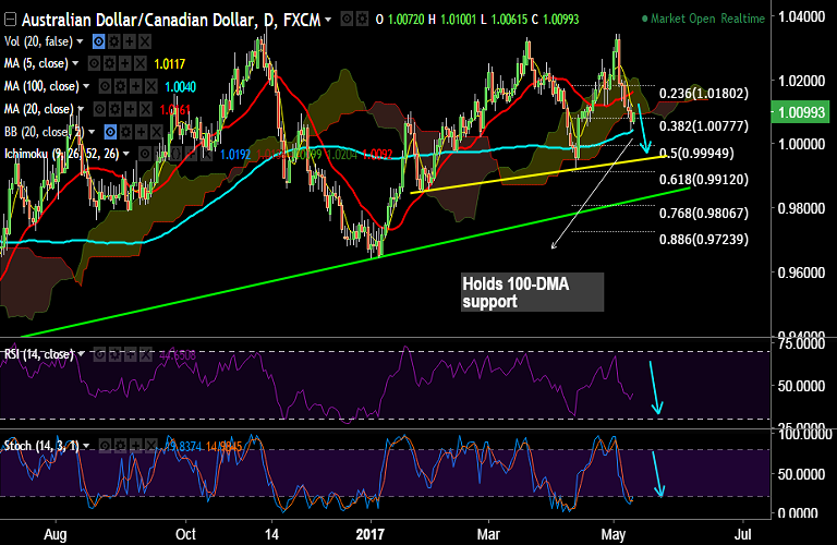 Support levels - 1.0077 (38.2% Fib of 0.9644 to 1.0345 rise), 1.0040 (100-DMA), 1.00 (50% Fib)
