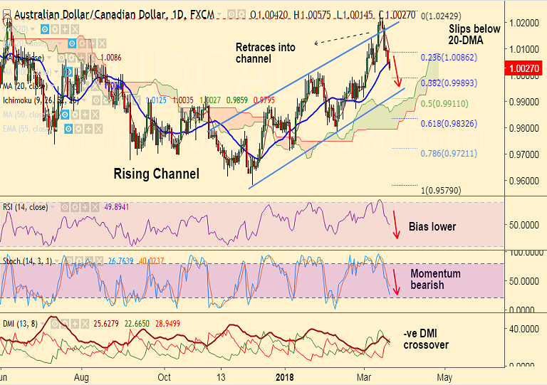 - AUD/CAD fails to hold and extend breakout above channel top, slips lower to currently trade at 1.0027 levels.