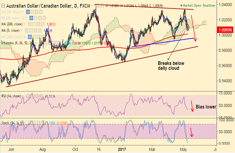 - AUD/CAD has dipped below daily cloud support at 1.0092, bias lower.