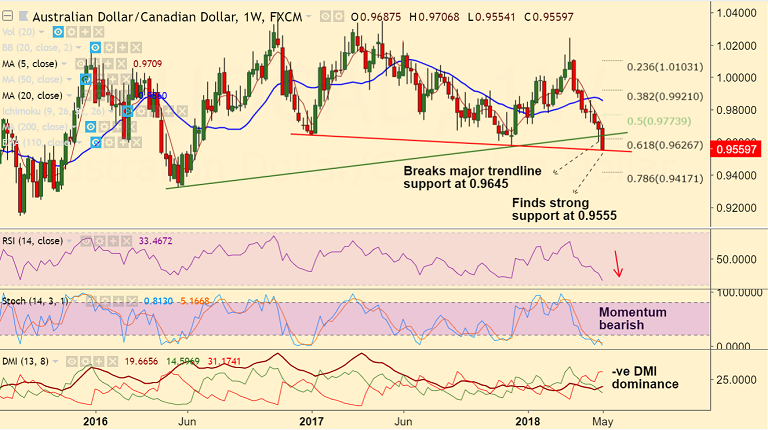 - The pair finds strong support at 0.9555 (trendline). Break below will accentuate weakness.