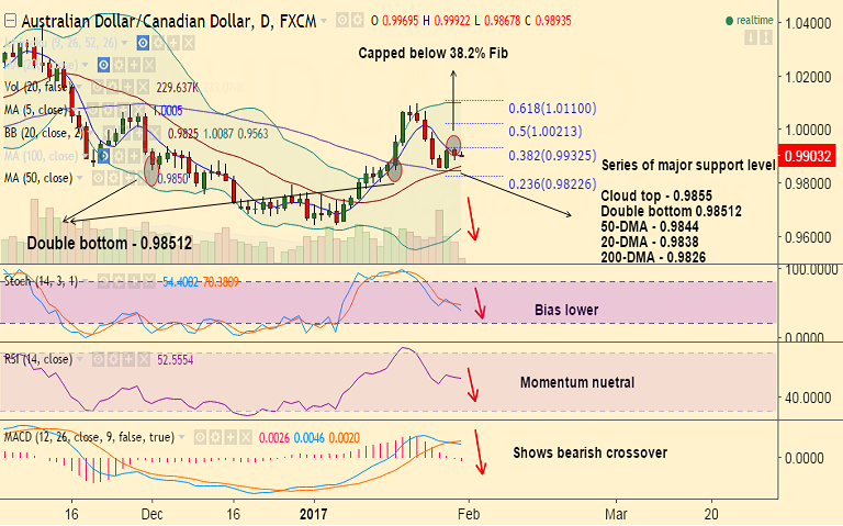 - The pair is pivotal around 0.9826 levels (200-DMA), break below will accentuate weakness. We then see scope for test of 0.9650 levels.