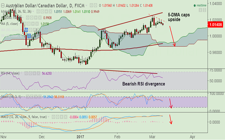 - AUD/CAD trades a narrow range, capped below 5-DMA, intraday bias lower.
