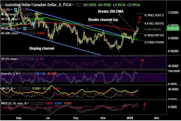 - AUD/CAD grinds higher after breaking above 200-DMA at 0.9906, bias higher.