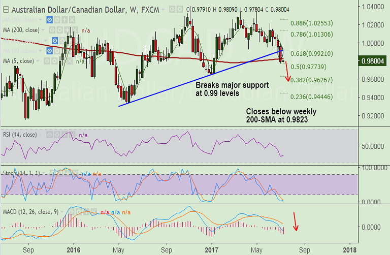 - AUD/CAD has broken below major trendline support at 0.99 levels, bias lower.