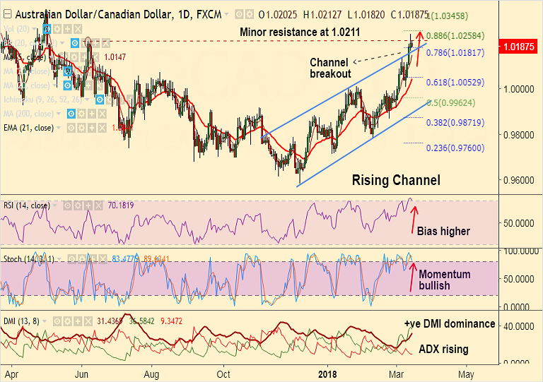- AUD/CAD is extending consolidation after breakout at channel top, scope for further upside.