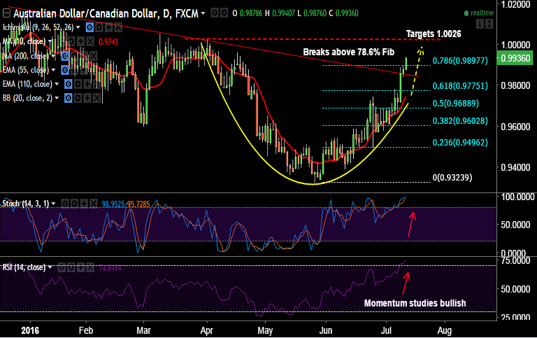 - AUD/CAD has broken above 78.6% Fib of .0054 to 0.9324 fall, as it extends upside along the 'Cup' formation.