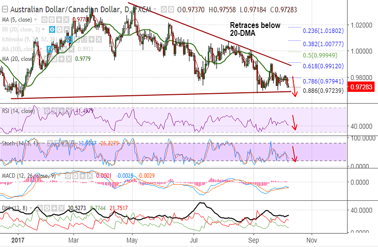 - The pair is seen struggling to extend above 20-DMA is stiff resistance at 0.9779.