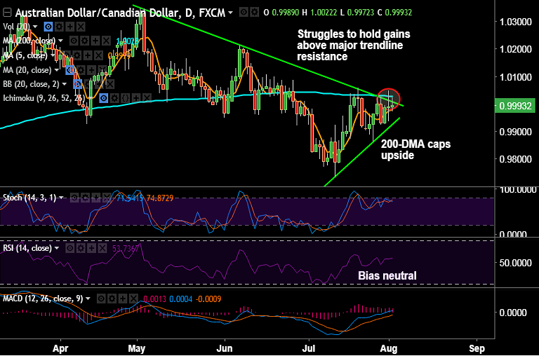- AUD/CAD struggles at major trendline resistance at 1.0015, bias remains neutral.