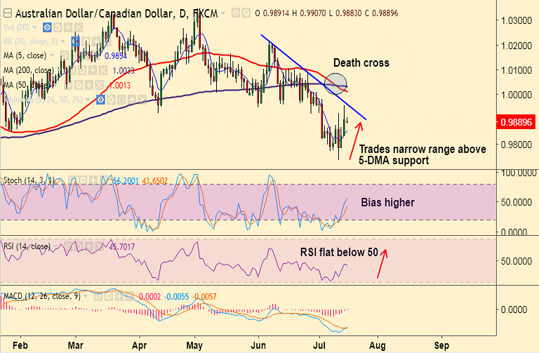 Resistance levels - 0.99, 0.9922 (20-DMA), 0.9955 (trendline), 1.0013 (50-DMA)