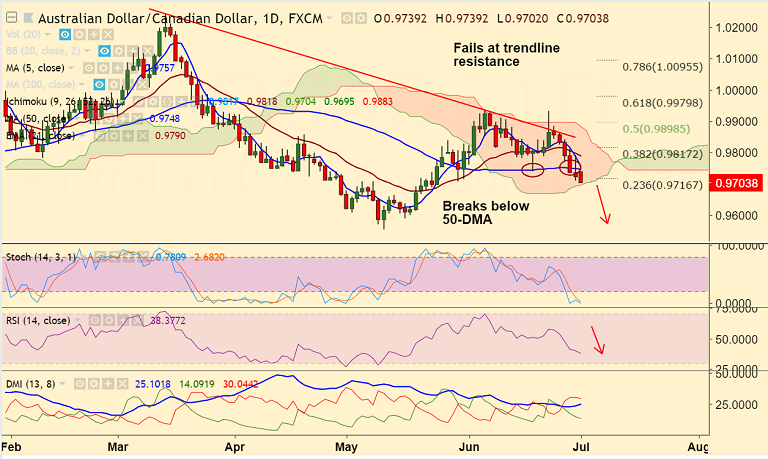 - The pair has broken support at 50-DMA and is on track for further downside.