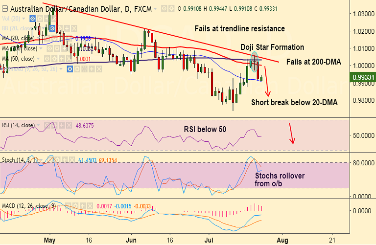 - Technical indicators are biased lower, the pair was rejected at trendline resistance, falls below 200-DMA.