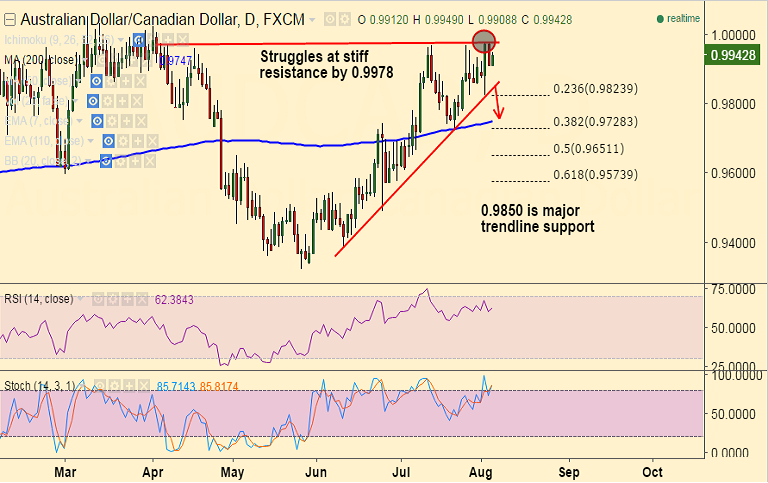 - AUD/CAD edged lower on Wednesday after facing rejection at stiff resistance around 0.9978 levels.