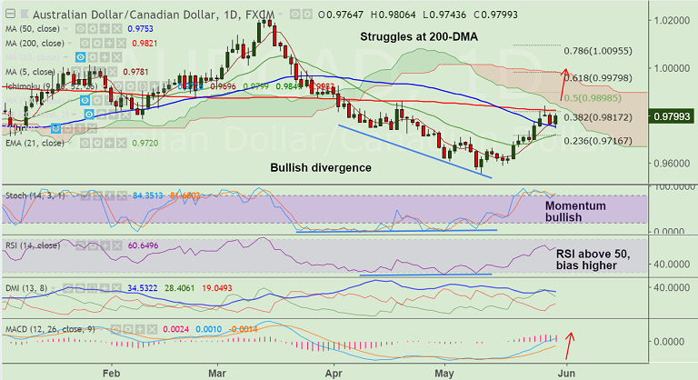 - Next bull target above 200-DMA lies at 100-DMA at 0.9878 ahead of 50% Fib at 0.9898.