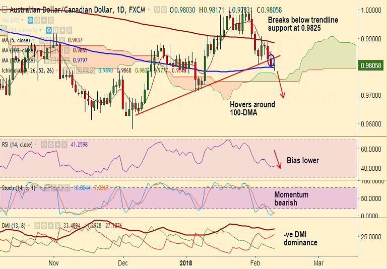 - Below 100-DMA the pair finds next major support at 0.9777 (cloud top). Breach at cloud support will accentuate weakness.