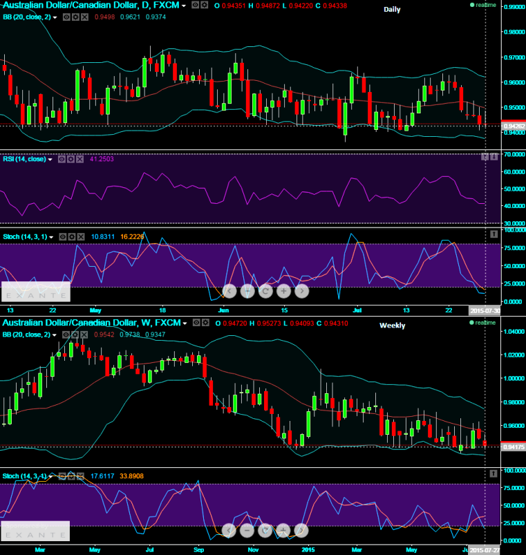 Both daily and weekly charts suggest weakness in the pair as the RSI is a clear downward convergence with the falling prices. The bearish candles have been flooding 2 weeks or so including spinning top, Doji occurred at 0.9601 and 0.9468 respectively. While stochastic still signifies selling pressure as there is no signs of %K line crossover even though curve reaching below 20 levels.