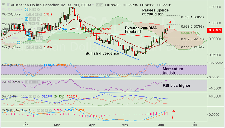 - The pair extends 200-DMA breakout. Break above daily cloud targets 61.8% Fib at 0.9979.