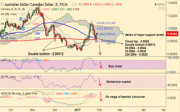 - The pair remains pivotal around 0.9826 levels (200-DMA), break below will accentuate weakness. We then see scope for test of 0.9650 levels.