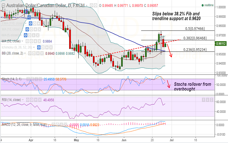 - AUD/CAD is extending downside from 2-month highs of 0.9745 hit on Friday (0.9746 is 50% Fib retrace of Dec 2015 to May 2016 fall).