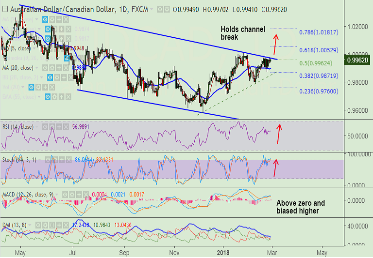 Resistance levels - 0.9937 (5-DMA), 0.9975 (major trendline), 1.00, 1.0052 (61.8% Fib retrace of 1.03458 to 0.9579 fall)