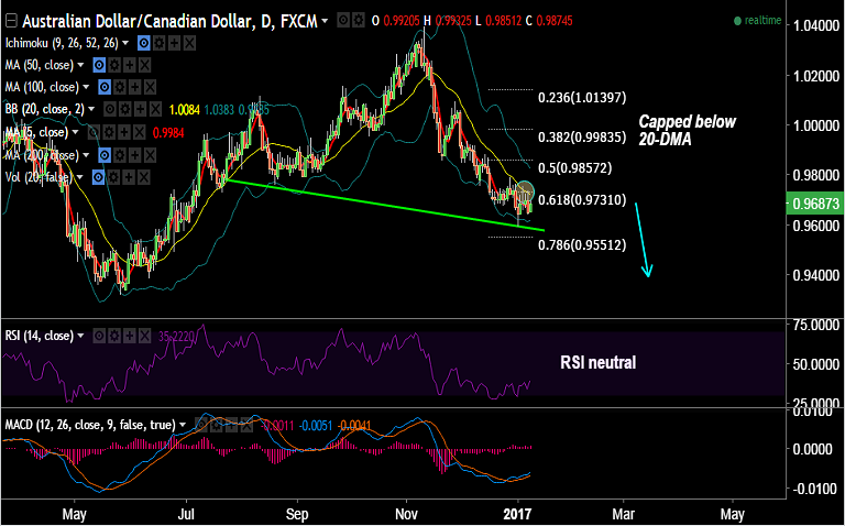 - AUD/CAD has been recovering from 6-month lows of 0.9594 on 2nd Jan, but upside remains capped by 20-DMA currently at 0.9723.