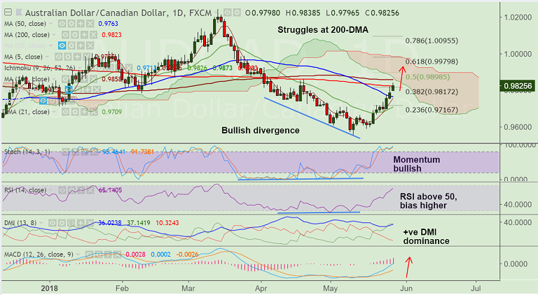 - Next bull target above 200-DMA lies at 100-DMA at 0.9858 ahead of 50% Fib at 0.9898.