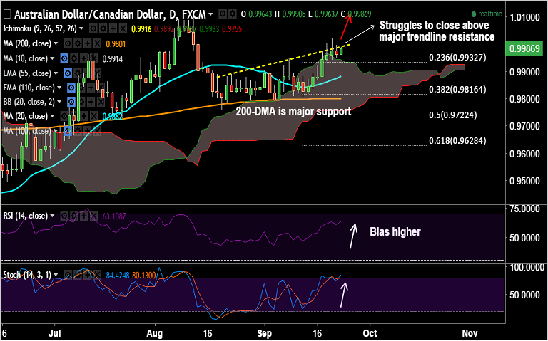- Major resistance levels - 0.9976 (Sept 19 high), 0.9990 (trendline), 1.0 (Aug 12 high)