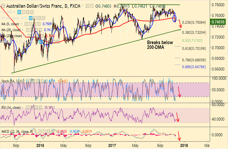 - Price action has broken below 200-DMA at 0.7546 and 23.6% Fib at 0.75.