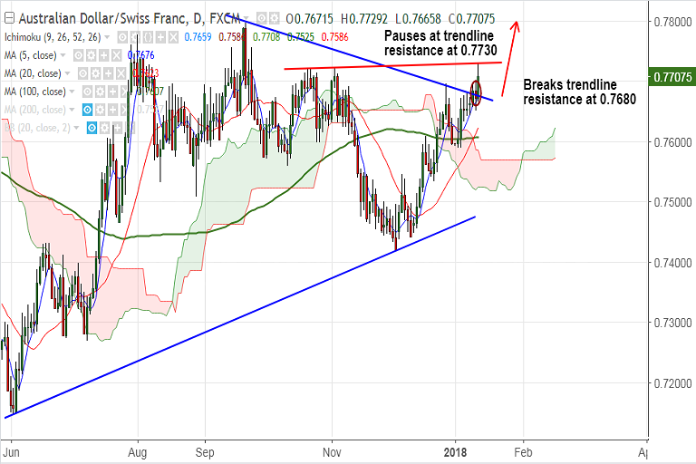 - The pair has hit 15-week highs at 0.7729 before paring some gains to currently trade at 0.77 levels.