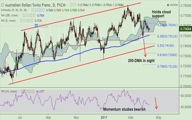 Support levels - 0.7538 (cloud base), 0.7504 (200-DMA), 0.7475 (Mar 27 low), 0.7435 (Nov 11, 2016 low)