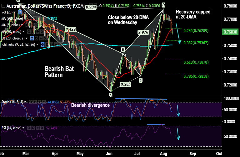- The pair has closed below 20-DMA and we see scope for test of 200-DMA at 0.7502.