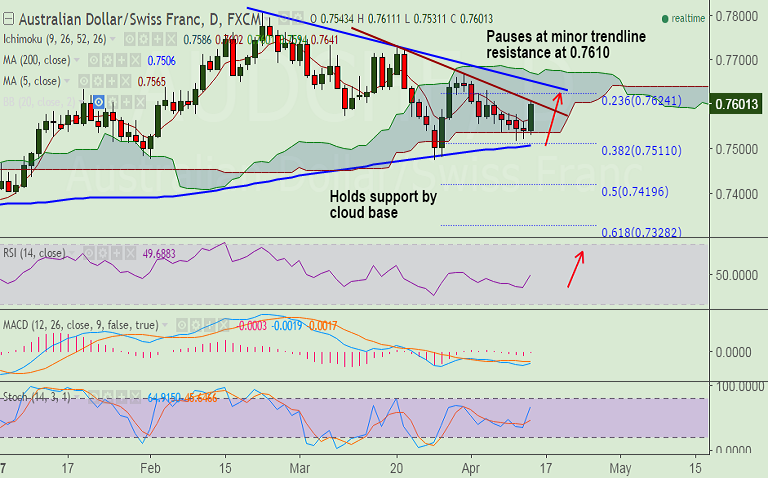 Resistance levels - 0.7610 (trendline), 0.7624 (23.6% Fib retrace of 0.7032 to 0.7807 rally), 0.7644 (50-DMA)