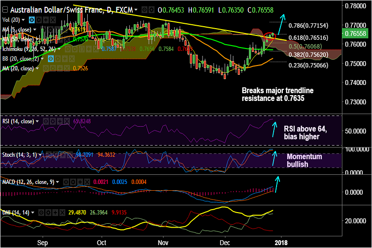 - AUD/CHF has shown break above major trendline resistance at 0.7635, bias higher.