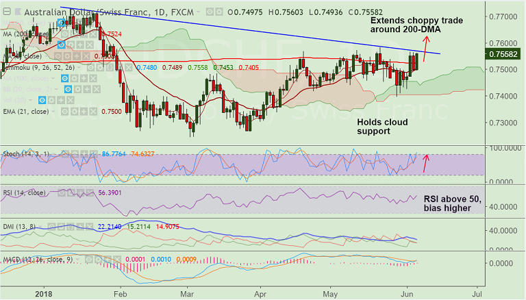 - AUD/CHF is extending choppy trade around 200-DMA at 0.7524, bias higher.