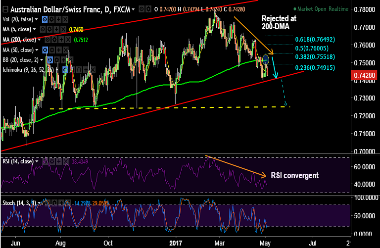 Resistance levels: 0.7450 (5-DMA), 0.7512 (200-DMA), 0.7544 (April 24 high), 0.7551 (38.2% Fib retrace of 0.7807 to 0.7394 fall)