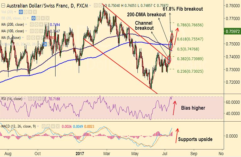 - Technical studies on weekly charts are also bullish. The pair has broken above weekly 50-SMA at 0.7467.