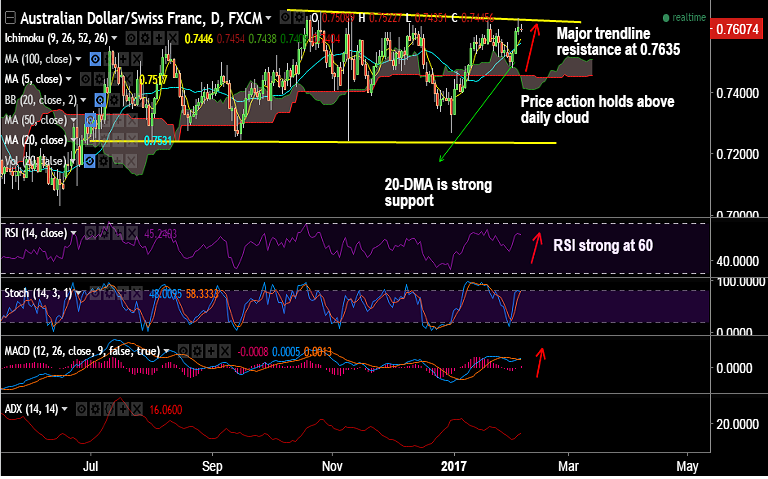 - The pair faces major trendline resistance at 0.7635, breakout will see further gains.