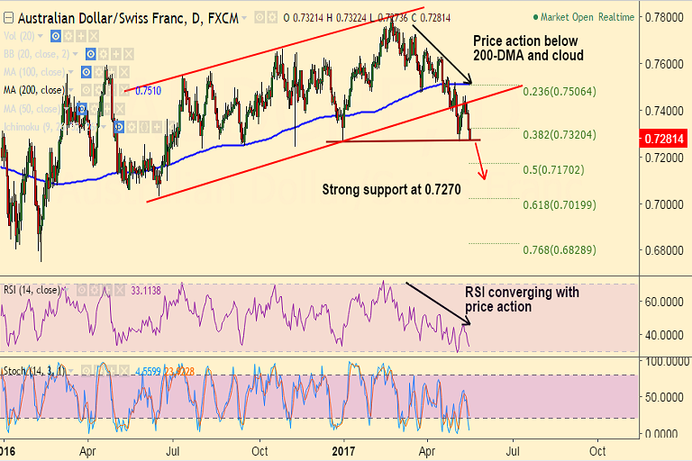 - RSI converging with price action and break below major support at 0.7270 will see drag lower.