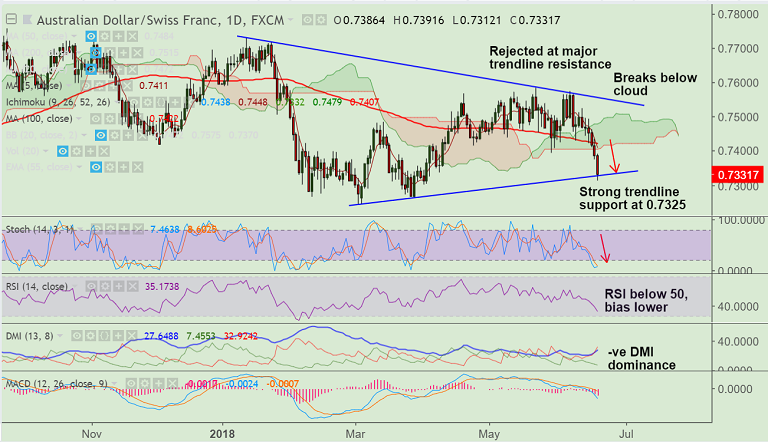 Support levels - 0.7325 (Triangle base), 0.73, 0.7263 (Mar 28 low), 0.7242 (2018 lows till date)