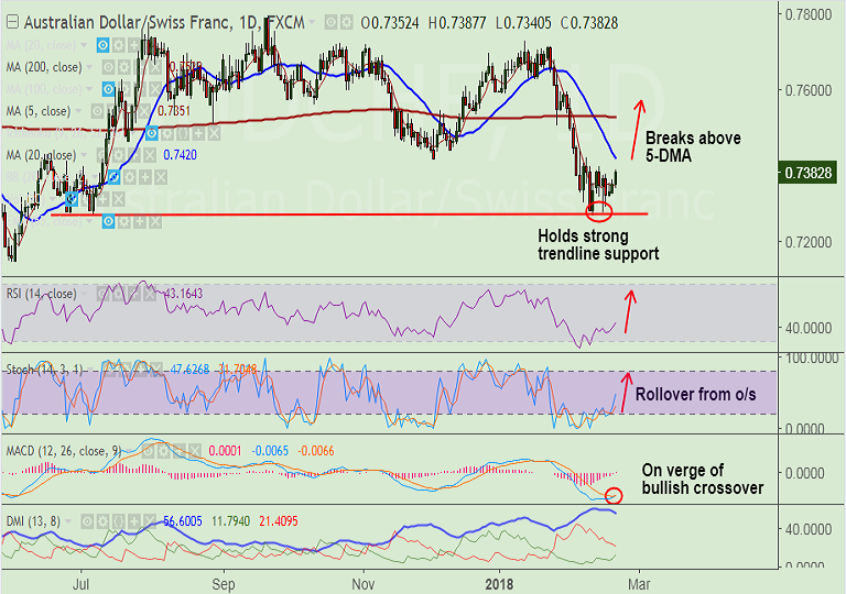 Support levels - 0.7349 (5-DMA), 0.73, 0.7265 (trendline)